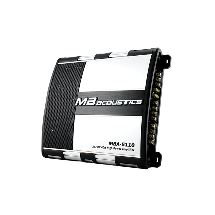 آمپلی فایر چهار کانال ام بی آکوستیک مدل MBA-5110 یکی از بهترین آمپلی فایر های مناسب جهت نصب اسپیکر و سابووفر در خودروی شماست.این آمپلی فایر که از کیفیت مطلوبی برخوردار میباشد ساخت کشور چین بوده و از صدای قابل قبولی برخوردارست.توان خروجی حداکثری ام بی آکوستیک 5110 برابر با 2470 وات بوده و یک آمپلی فایر 4 کانال میباشد.لازم به ذکر است این آمپلی فایر از قابلیت پل زنی نیز برخوردارست.5110 ام بی آکوستیک دارای توان اسمی 65×4 وات بر روی 4 اهم،90×4 بر روی 2 اهم و 180×2 وات در حالت پل (Bridge) میباشد.
