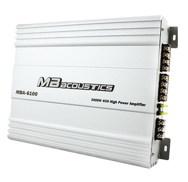 آمپلی فایر چهار کانال ام بی آکوستیک مدل MBA-6100 یکی از بهترین آمپلی فایر های مناسب جهت نصب اسپیکر و سابووفر در خودروی شماست.این آمپلی فایر که از کیفیت مطلوبی برخوردار میباشد ساخت کشور چین بوده و از صدای قابل قبولی برخوردارست.توان خروجی حداکثری ام بی آکوستیک 6100 برابر با 3000 وات بوده و یک آمپلی فایر 4 کانال میباشد.لازم به ذکر است این آمپلی فایر از قابلیت پل زنی نیز برخوردارست.6100 ام بی آکوستیک دارای توان اسمی 70×4 وات بر روی 4 اهم،100×4 بر روی 2 اهم و 200×2 وات در حالت پل (Bridge) میباشد.