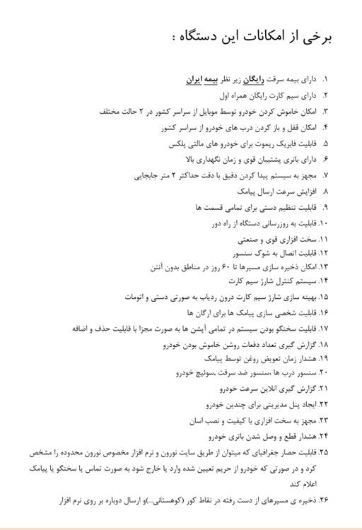 دارای بیمه سرقت رایگان از بیمه ایران دارای سیم کارت رایگان همراه اول با فعال سازی رایگان امکان خاموش کردن خودرو توسط موبایل از سراسر کشور در 2حالت مختلف امکان قفل و باز کردن درب های خودرو از سراسر کشور قابلیت فابریک ریموت برای خودرو های مالتی پلکس دارای باتری پشتیبان قوی و زمان نگهداری بالا به همراه مدار شارژ اتوماتیک مجهز به سیستم پیدا کردن دقیق با دقت حداکثر 2متر جابجایی افزایش دهنده ارسال پیامک قابلیت تنظیم دستی برای تمامی قسمت ها قابلیت به روزرسانی دستگاه از راه دور برای نسخه های جدید سخت افزاری قوی و صنعتی با پردازشگر قدرتمند قابلیت اتصال به شوک سنسور امکان ذخیره سازی مسیرها تا 60روز در مناطق بدون آنتن سیستم کنترل شارژ سیم کارت بهینه سازی شارژ سیم کارت درون ردیاب به صورتی دستی و اتومات قابلیت شخصی سازی پیامک ها برای ارگان ها و سازمان ها قابلیت سخنگو بودن سیستم در تمامی آپشن ها به صورت مجزا با قابلیت حذف و اضافه هشدار زمان تعویض روغن توسط پیامک و سامانه سنسور درب ها ،سنسور ضد سرقت ,سوئیچ خودرو گزارش گیری انلاین سرعت خودرو گزارش گیری آنلاین مصرف سوخت گزارش گیری میزان مسافت پیموده شده گزارش گیری تعداد دفعات روشن خاموش بودن خودرو گزارش زمان روشن بودن خودرو به صورت اکسل ایجاد پنل مدیریتی برای چندین خودرو هشدار قطع و وصل شدن باتری خودرو قابلیت حصار جغرافیای که میتوان از طریق سایت نورون و نرم افزار مخصوص نورون محدوده را مشخص کرد و در صورتی که خودرو از حریم تعیین شده وارد یا خارج شود به صورت تماس یا سخنگو یا پیامک اعلام کند ذخیره ی مسیرهای از دست رفته در نقاط کور (کوهستانی..).و ارسال دوباره بر روی نرم افزار امکان تعیین حد مجاز سرعت یا سرعت غیر مجاز که به صورت هشدار سخنگو یا تماس به مدیر سیستم اعلام میکند هشدار در صورت خارج شدن از پوشش شبکه موبایل و برگشت مجدد به شبکه همراه قفل کودک، قفل شدن دربها بعد از حرکت خودرو امکان اتصال میکروفن جهت شنیدن صدای داخل کابین خودرو امکان کنترل کردن 500خودرو از یک نرم افزار امکان کار کردن همزمان 50کاربر بصورت آفلاین و بینهایت کاربر بصورت آنلاین از سیستم قابلیت نمایش زنده و ثانیه به ثانیه حرکت خودرو بر روی نقشه پشتیبانی از 4 نقشه google map ، open street،bing، leaflet پشتیبانی از GPS-GSM-GPRS قابلیت جایگذاری تمامی اپراتورهای سیم کارت(رایتل –ایرانسل-همراه اول) قابلیت استعلام گیری سیم کارت از روی نرم افزار پشتیبانی نرم افزار کاملا فارسی و انگلیسی اندروید و ios قابل نصب روی تمامی خودروهای داخلی و خارجی بدون اختلال در برق خودرو